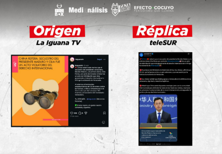 - Tres casos de publicaciones de La Iguana TV replicadas en las redes sociales de portales como teleSUR y CGTN. (Ej: La Iguana TV, teleSUR)