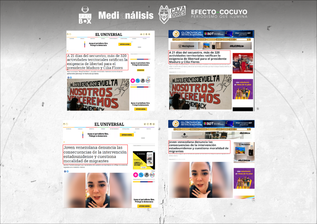 Este hecho fue particularmente visible en El Universal y Globovisión, donde se identificaron 132 publicaciones que compartían encabezados idénticos, redacción equivalente y estructura narrativa prácticamente calcada.