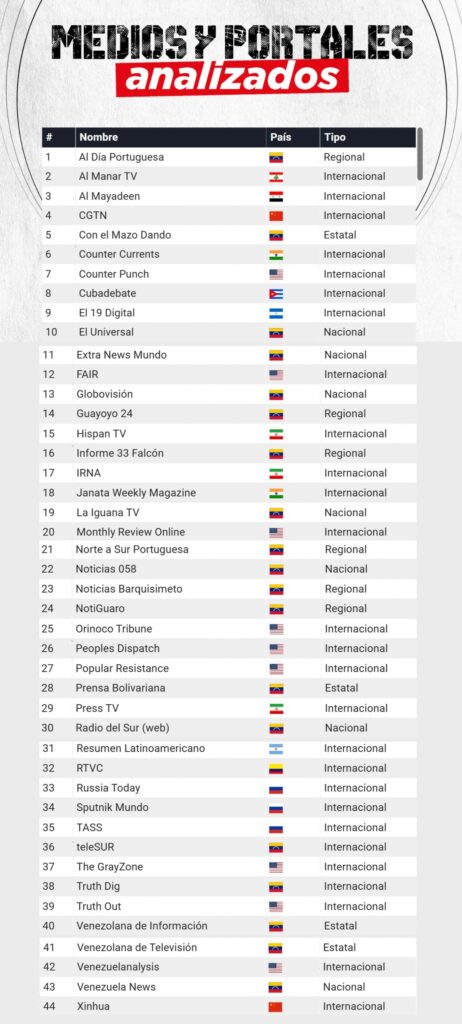 Este discurso atravesó plataformas estatales como Venezolana de Televisión (VTV), otras supuestamente independientes como la Agencia Venezuela News o La Iguana TV y se expandió a medios rusos, chinos, iraníes, indios y hasta estadounidenses; llegando a una red de 44 medios, que incluye no solo sus portales web, sino también sus cuentas en redes sociales.
