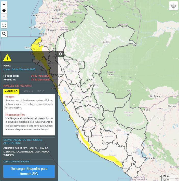 Otoño cálido. El Servicio Nacional de Meteorología e Hidrología (Senamhi) emitió una alerta amarilla en Lima y gran parte de la costa peruana por temperaturas “de moderada intensidad”.A través de su página web, el organismo advirtió que las temperaturas en algunas zonas del litoral peruano llegarán hasta los 37 grados centígrados.“Se prevé escasa nubosidad hacia el mediodía, lo que favorecerá el incremento de los niveles de radiación ultravioleta (UV)”, indicó el ente estatal.“Asimismo, se esperan ráfagas de viento con velocidades cercanas a los 35 km/h, principalmente durante horas de la tarde”, añadió.La alerta amarilla del Senamhi estará activa el domingo y lunes, 29 y 30 de marzo, en Áncash, Arequipa, Callao, Ica, La Libertad, Lambayeque, Lima, Piura y Tumbes.