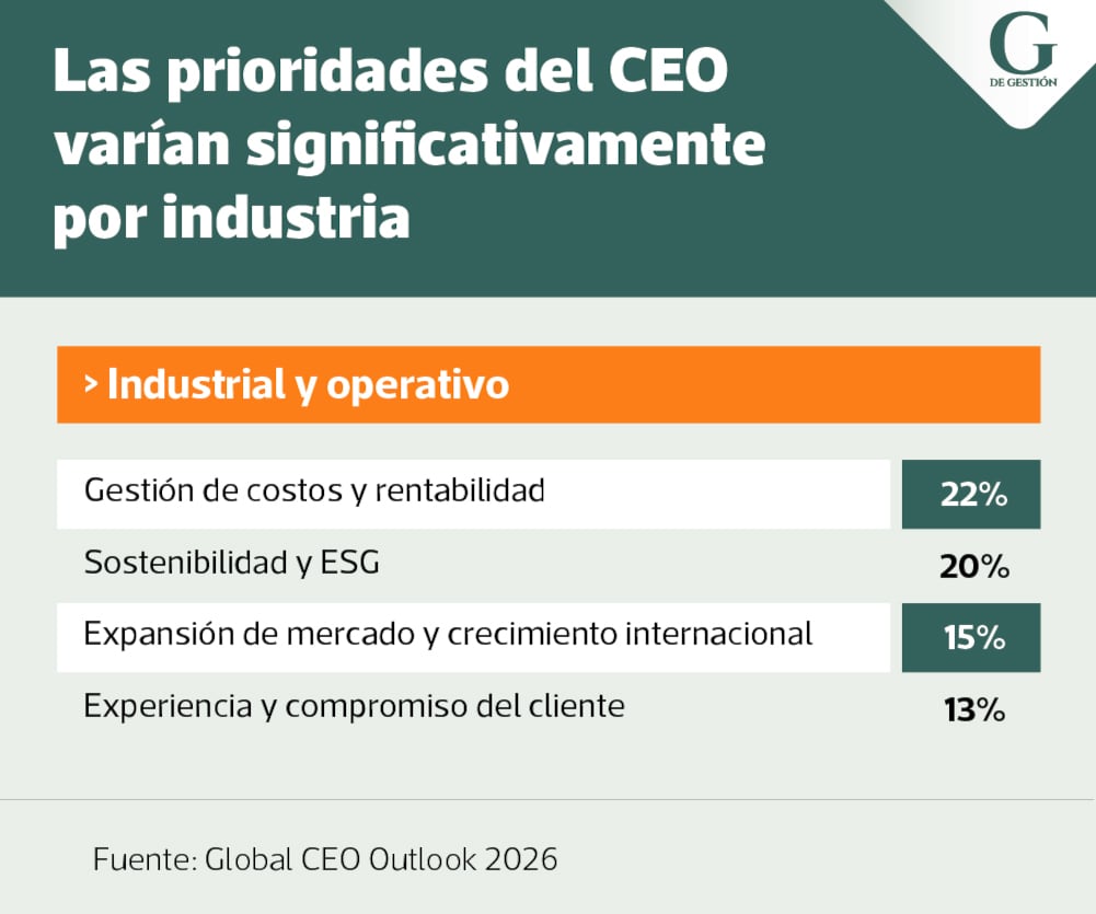 Ante la pregunta sobre sus principales prioridades para el 2026, los CEOs locales señalaron: sostenibilidad y ESG (44%), expansión de mercado y crecimiento internacional (40%), y transformación digital e inteligencia artificial (35%). (Ver cuadro completo)
