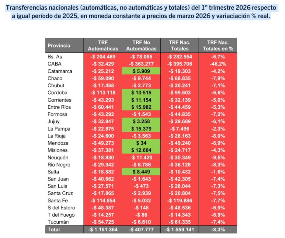 El último informe de la consultora Politikón Chacho revela una caída interanual promedio del -8,4% en los 24 distritos en sus transferencias de Nación durante el primer trimestre del año. Ese rojo condiciona cualquier negociación política y también las perspectivas electorales de las provincias.