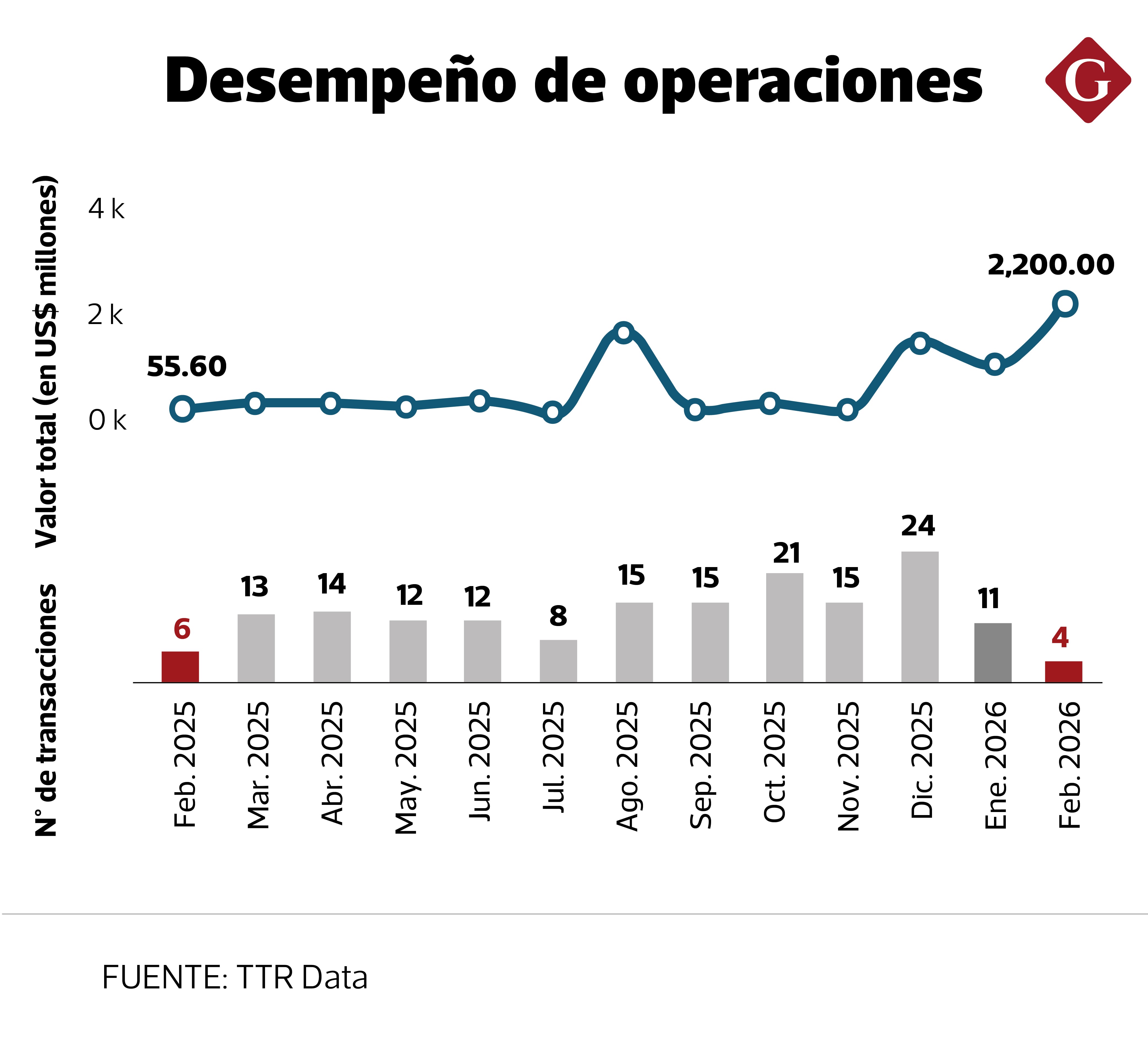 Según información de la consultora Transactional Track Record (TTR), al cierre de febrero se han registrado 15 transacciones por un valor de US$ 3,200 millones, lo que significa como número de deals una contracción de cerca de 32%, pero un incremento de aproximadamente 2,413% en comparación a la actividad de los dos primeros meses del 2025. En este periodo, la operación clave por su ticket fue la de la canadiense CPP Investments (Canada Pension Plan Investment Board), la cual anunció la adquisición por un valor de US$ 1,700 millones del 50% de Inkia Energy, empresa que controla activos energéticos en el Perú y otros mercados.