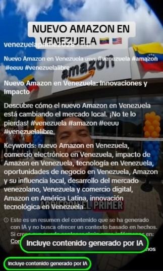 El video de 10 segundos que anuncia que “Hoy estamos haciendo historia”, tras la supuesta inauguración de Amazon, cuya estructura muestra con la frase “vean esta belleza”, y explica que “ahora uno puede venir a comprar directo y también pedir”, fue compartido el 17 de enero de 2026 por la cuenta de TikTok @venezuelaprime2028.