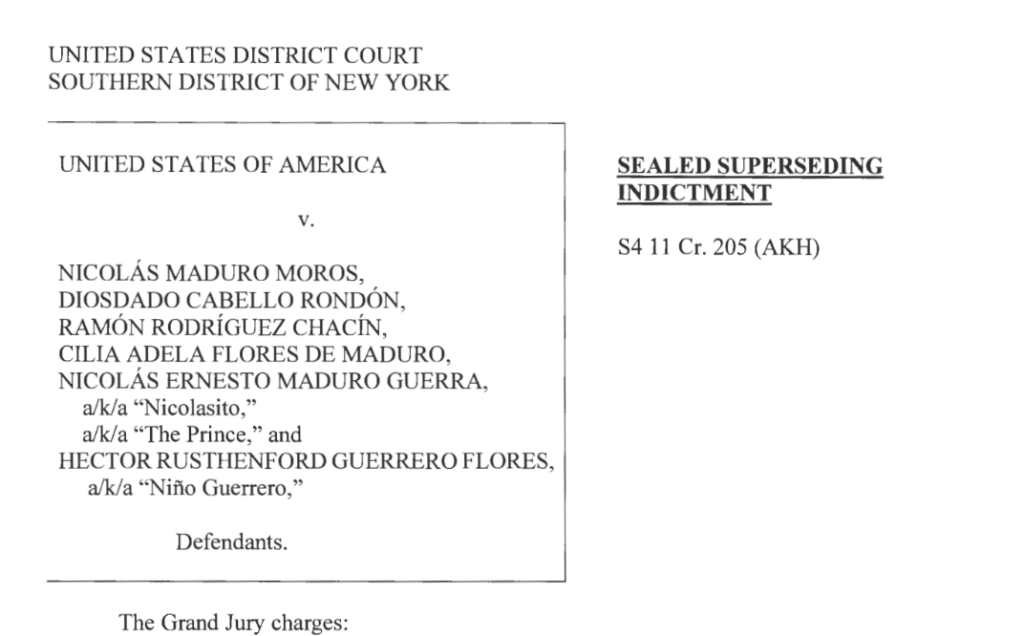 Cabello, junto al diputado e hijo del exgobernante venezolano, Nicolás Maduro Guerra; el exministro del Interior de Hugo Chávez, Ramón Rodríguez Chacín y Héctor Guerrero alias «El Niño Guerrero», líder de la Banda Tren de Aragua, aparecen como «coacusados prófugos» en la acusación contra Nicolás Maduro y Cilia Flores en EEUU por supuesto narcoterrorismo, conspiración para traficar cocaína hacia ese país y posesión de armas, por lo que el destino legal del Secretario general del Psuv en este caso es incierto.