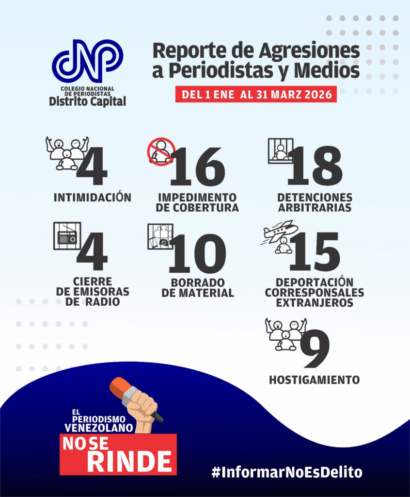 La Seccional Distrito Capital del Colegio Nacional de Periodistas de Venezuela (CNP Caracas) denunció este lunes que, entre el 1 de enero y el 31 de marzo de 2026, se cometieron 76 agresiones contra periodistas y medios de comunicación en el país.