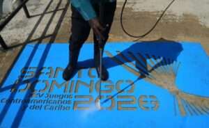 El Comité Organizador de los Juegos Centroamericanos y del Caribe Santo Domingo 2026 lleva a cabo una campaña promocional en diferentes puntos de la capital utilizando un sistema conocido como “grafitti” inverso, que consiste en limpiar parte de las aceras con agua a presión.