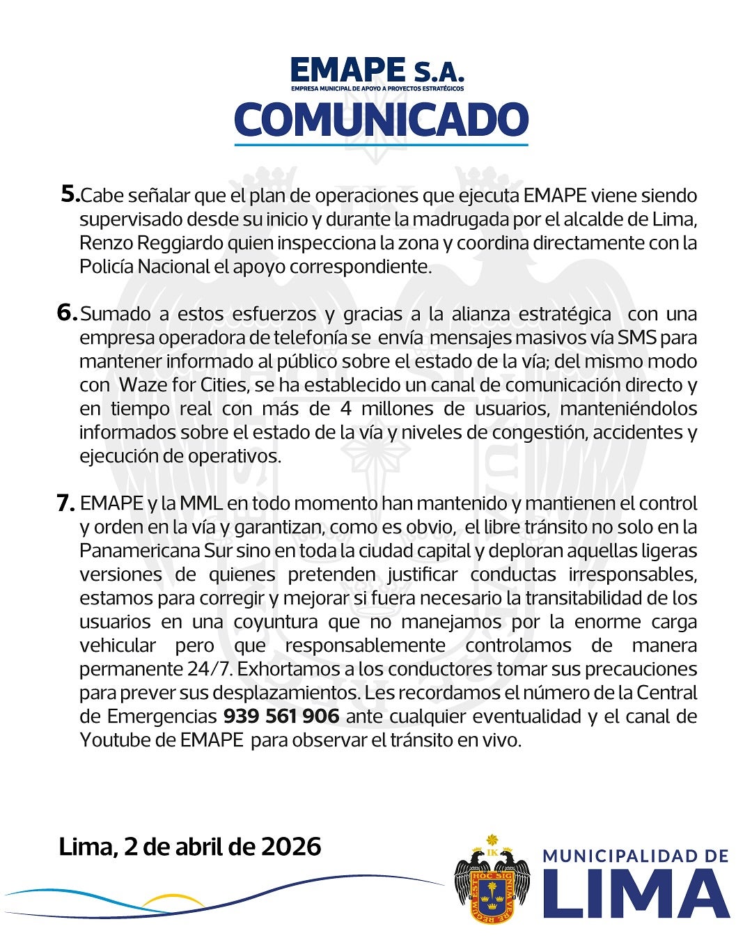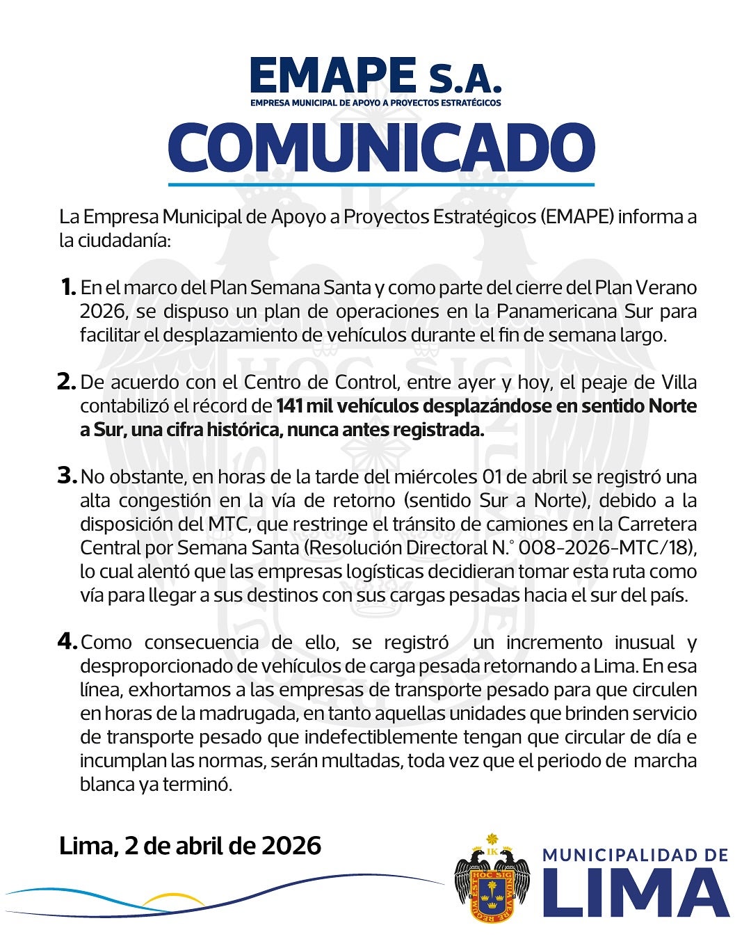 El desvío de carga pesada como factor críticoUn segundo factor determinante para el colapso, según detalló EMAPE en un comunicado oficial, fue la restricción impuesta por el Ministerio de Transportes y Comunicaciones (MTC) en la Carretera Central.Esta medida, que limita el tránsito de camiones por dicha vía durante Semana Santa, empujó a las empresas logísticas a utilizar la Panamericana Sur como ruta alterna para llevar sus cargas hacia el sur del país.Esto generó un aumento que la autoridad municipal calificó de inusual y desproporcionado de vehículos de carga pesada retornando hacia Lima.Ante esta situación, la empresa municipal anunció que el periodo de "marcha blanca" ha finalizado y que se procederá a multar a las unidades de transporte pesado que circulen en horario diurno incumpliendo las normas vigentes.La institución exhortó a este sector a realizar sus desplazamientos exclusivamente durante la madrugada para no interferir con el flujo de vehículos ligeros y pasajeros.
