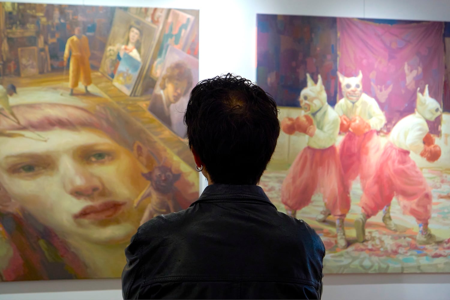 El artista urbano Rodrigo Estoy, famoso por sus inmensos murales repartidos por distintos edificios y paredes de Santiago, pasa de la agresiva intemperie de la calle a la controlada elegancia del Palacio Vergara en Viña. Hasta el 17 de mayo, en sus salones neogóticos, se exhibirá su trabajo, que mantiene su estética surreal, donde intersecan animales, humanos y espectrospero ahora en óleo sobre tela.