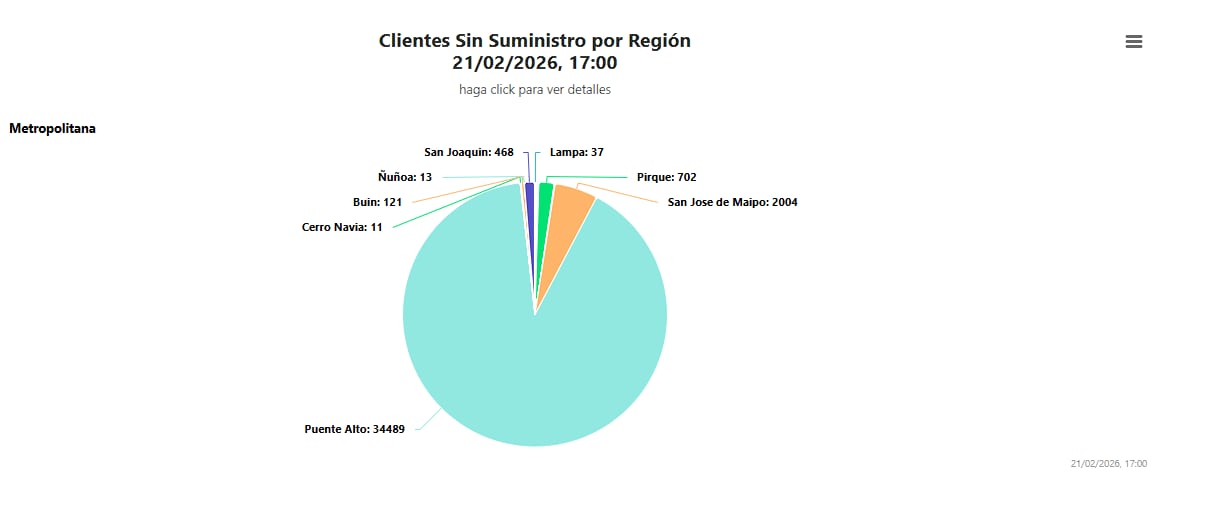 Según lo informado por la Superintendencia de Electricidad y Combustibles (SEC) a las 17:00 del sábado, más de 34 mil clientes no tenían electricidad solamente en Puente Alto.