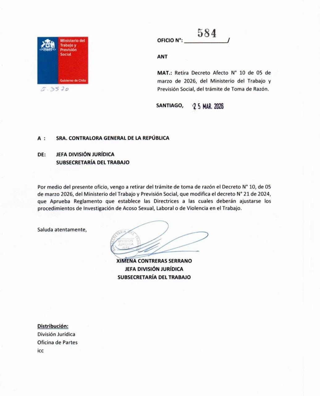 El pasado viernes se dio a conocer el retiro de la Contraloría General de la República (CGR) de la Toma de Razón del Decreto N° 10 del Ministerio del Trabajo y Previsión Social.