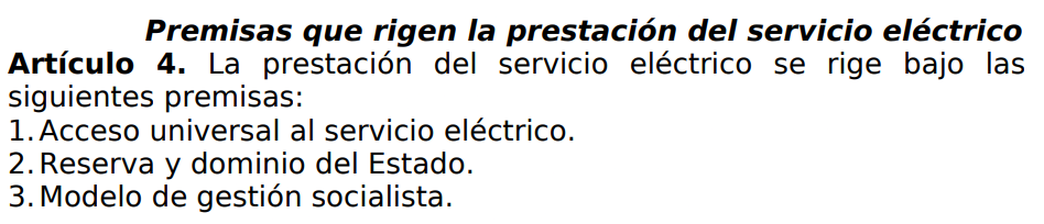 La Ley Orgánica del Sistema y Servicio Eléctrico establece como principio fundamental la reserva y dominio del Estado sobre el servicio eléctrico. En su artículo 4, se señala que la prestación del servicio se rige por el “dominio del Estado”, lo que implica que las decisiones sobre su gestión y mantenimiento corresponden al gobierno venezolano.