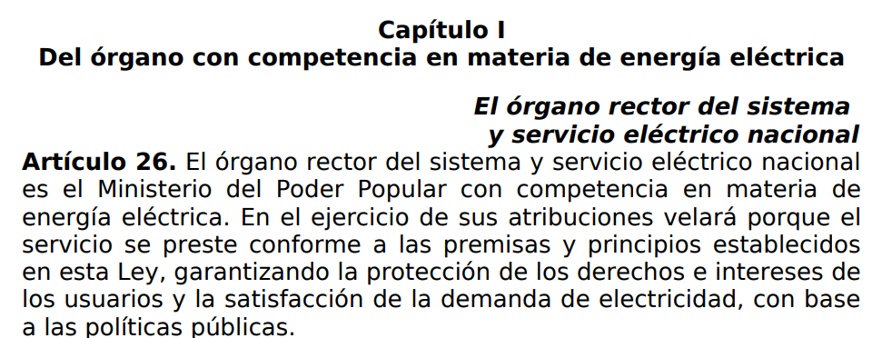Además, el artículo 26 de esta misma ley define que el órgano rector del sistema eléctrico es el Ministerio con competencia en energía eléctrica, encargado de dictar políticas, supervisar el sistema y garantizar la prestación del servicio.