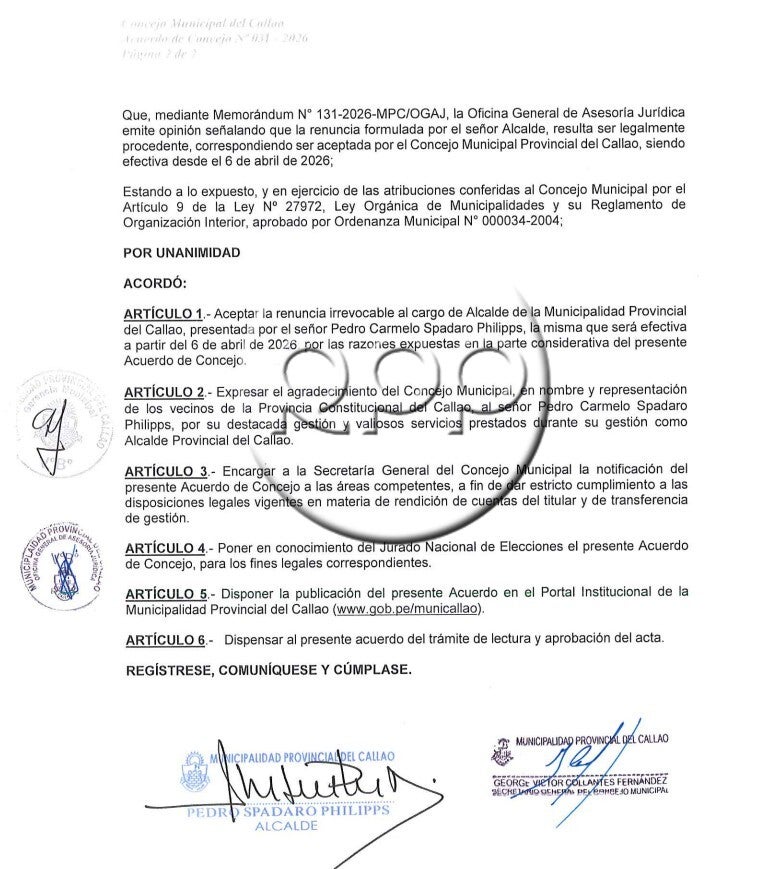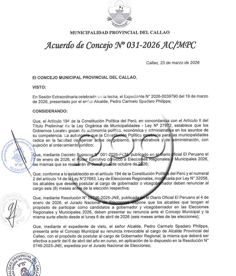 Pedro Spadaro presentó su renuncia al cargo de alcalde provincial del Callao, para poder postular en las próximas Elecciones Regionales y Municipales 2026, que se celebrarán en octubre próximo.En el acuerdo de concejo N° 031-2026 AС/МPС, con fecha de 23 de marzo de 2026, se precisa que la renuncia "deberá ser efectiva a partir del 6 de abril del año en curso, en aplicación de lo dispuesto en la Resolución N° 0746-2025-JNE, expedida por el Jurado Nacional de Elecciones"."Mediante el expediente de visto, el señor alcalde, Pedro Carmelo Spadaro Philipps, presenta ante el Concejo Municipal su renuncia irrevocable al cargo de alcalde provincial del Callao, con el propósito de postular al cargo de Gobernador Regional, la misma que deberá ser efectiva a partir del 6 de abril del año en curso, en aplicación de lo dispuesto en la Resolución N° 0746-2025-JNE, expedida por el Jurado Nacional de Elecciones", se lee en el documento.La resolución tiene la firma de Pedro Spadaro y George Victor Collantes Fernández, secretario general del Concejo Municipal de la Municipalidad de Provincial del Callao.Ante ello, César Pérez fue designado como nuevo alcalde del Callao, que anteriormente ocupaba el cargo de teniente alcalde de la Municipalidad Provincial. Fechas límites para renunciarCabe mencionar que la fecha límite para que los gobernadores y vicegobernadores que quieran postular a una alcaldía renuncien a sus cargos es el lunes, 6 de abril; misma fecha para que alcaldes que busquen una opción como gobernador o vicegobernador renuncien a sus cargos.Por otro lado, los altos funcionarios (ministros, viceministros, magistrados del Poder Judicial, del Ministerio Público y del Tribunal Constitucional, contralor general de la República, miembros de la JNJ, del JNE, Reniec, ONPE, defensor del Pueblo, BCR, superintendente de SBS, etc.) tienen hasta el martes, 7 de abril, para renunciar a sus cargos y postular a gobiernos regionales.Asimismo, para aquellos altos funcionarios que busquen una opción en alcaldías, la fecha límite de renuncia es el 16 de junio.Las elecciones regionales y municipales tienen como fecha a realizarse en el mes de octubre de este año.