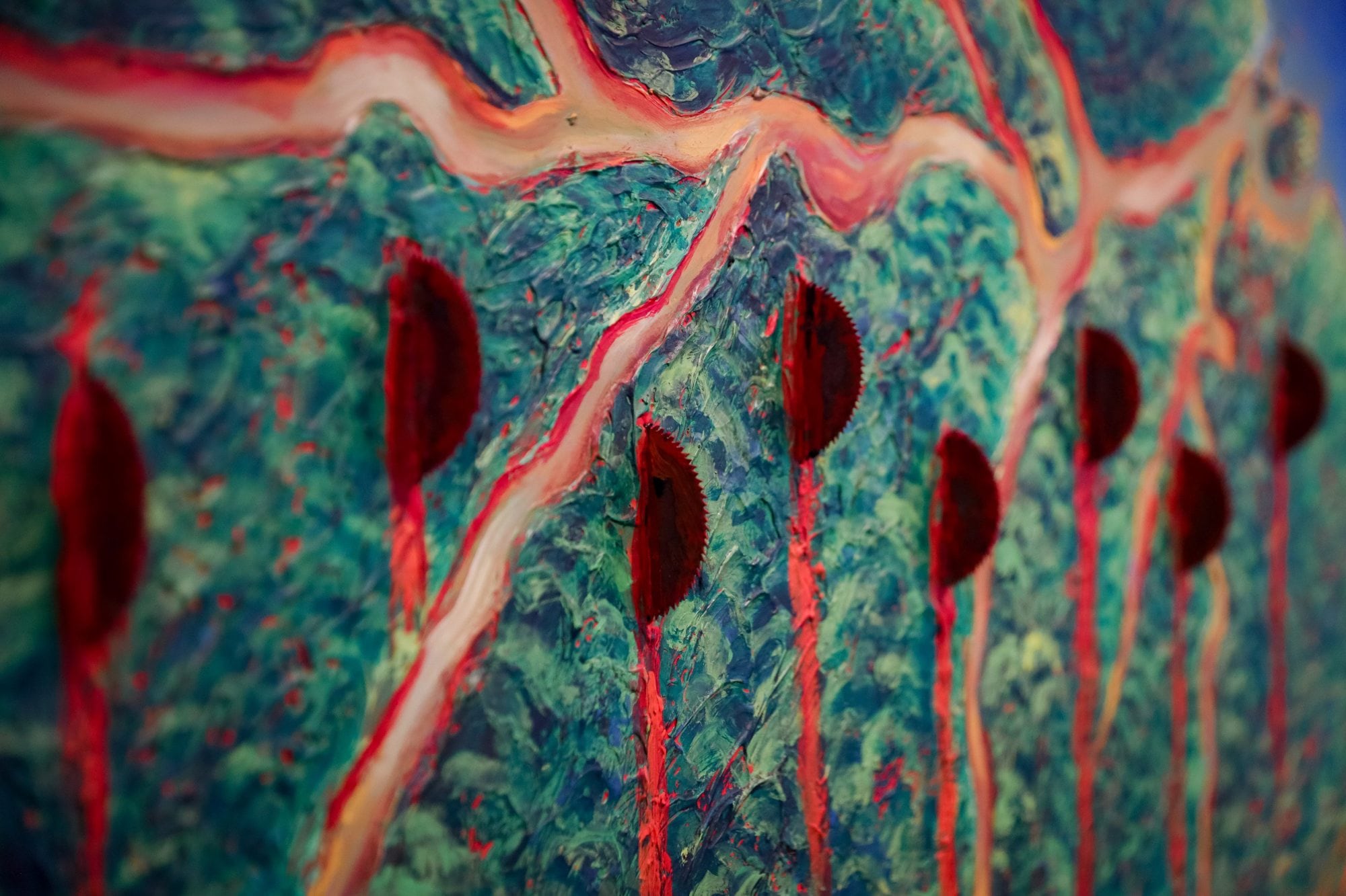 En este moderno edificio de tres pisos remodelado por el propio García Uriburu, que antes fue vivero y boliche bailable, se pueden encontrar desde botellas con aguas de sus famosas coloraciones en distintos países y algunos de los delfines que presentó en el parisino Museo Galliera, hasta registros fotográficos de la plantación de robles junto a Joseph Beuys en Documenta en 1982, muebles con espinas y pinturas atravesadas por sierras circulares. “Ahí aparece el contraste entre naturaleza y civilización –observa Mezza-. Sobre un mismo tema, él puede pintar tanto algo terrible como clásicamente bello”.