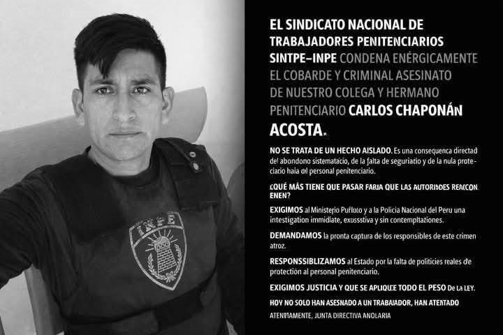 Entre tanto, el Sindicato Nacional de Trabajadores Penitenciarios (Sintpe-Inpe), a través de sus redes sociales, condenó enérgicamente el asesinato de Carlos Chapoñán.