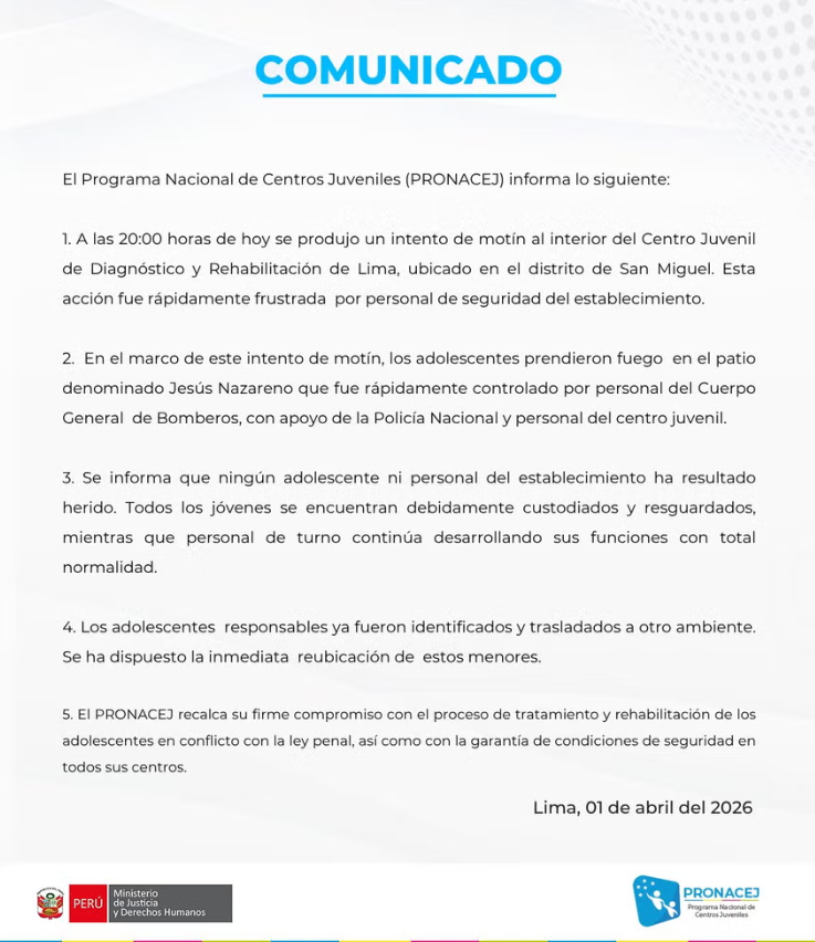 Asimismo, señaló que los adolescentes involucrados fueron identificados y trasladados a otro ambiente. “Se ha dispuesto la inmediata reubicación de estos menores”, concluyó la institución.