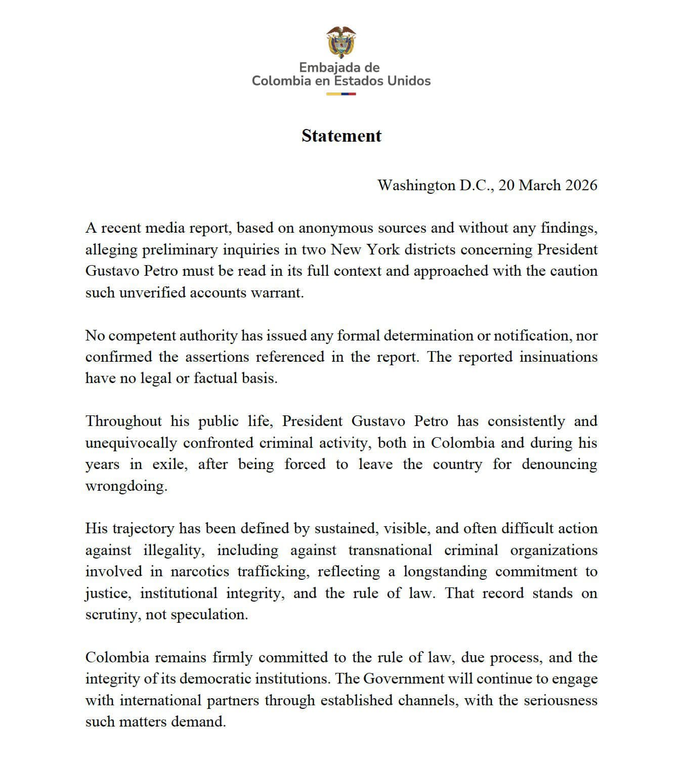 La legación diplomática en Washington además recordó que el mandatario sudamericano “ha enfrentado de manera consistente e inequívoca la criminalidad, tanto en Colombia como durante sus años en el exilio, al que se vio obligado tras denunciar actos ilícitos”.