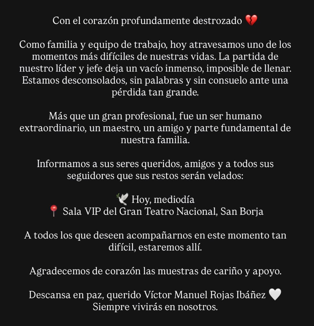 La familia de Manolo Rojas emitió un comunicado a través de las redes sociales tras confirmarse la repentina partida del humorista. En el mensaje expresaron su desconsuelo y el vacío que deberán afrontar de ahora en adelante."Con el corazón profundamente destrozado como familia y equipo de trabajo, hoy atravesamos uno de los momentos más difíciles de nuestras vidas. La partida de nuestro líder y jefe deja un vacío inmenso, imposible de llenar. Estamos desconsolados, sin palabras y sin consuelo ante una pérdida tan grande", indicaron en el escrito.Más allá de su labor como artista, la familia resaltó su calidad humana con su entorno y admiradores: "Fue un ser humano extraordinario, un maestro, un amigo y parte fundamental de nuestra familia".Finalmente, invitaron al público en general a darle el último adiós, que se realiza en la sala VIP del Gran Teatro Nacional."A todos los que deseen acompañarnos en este momento tan difícil, estaremos allí. Agradecemos de corazón las muestras de cariño y apoyo. Descansa en paz, querido Víctor Manuel Rojas Ibáñez. Siempre vivirás en nosotros", concluyeron.