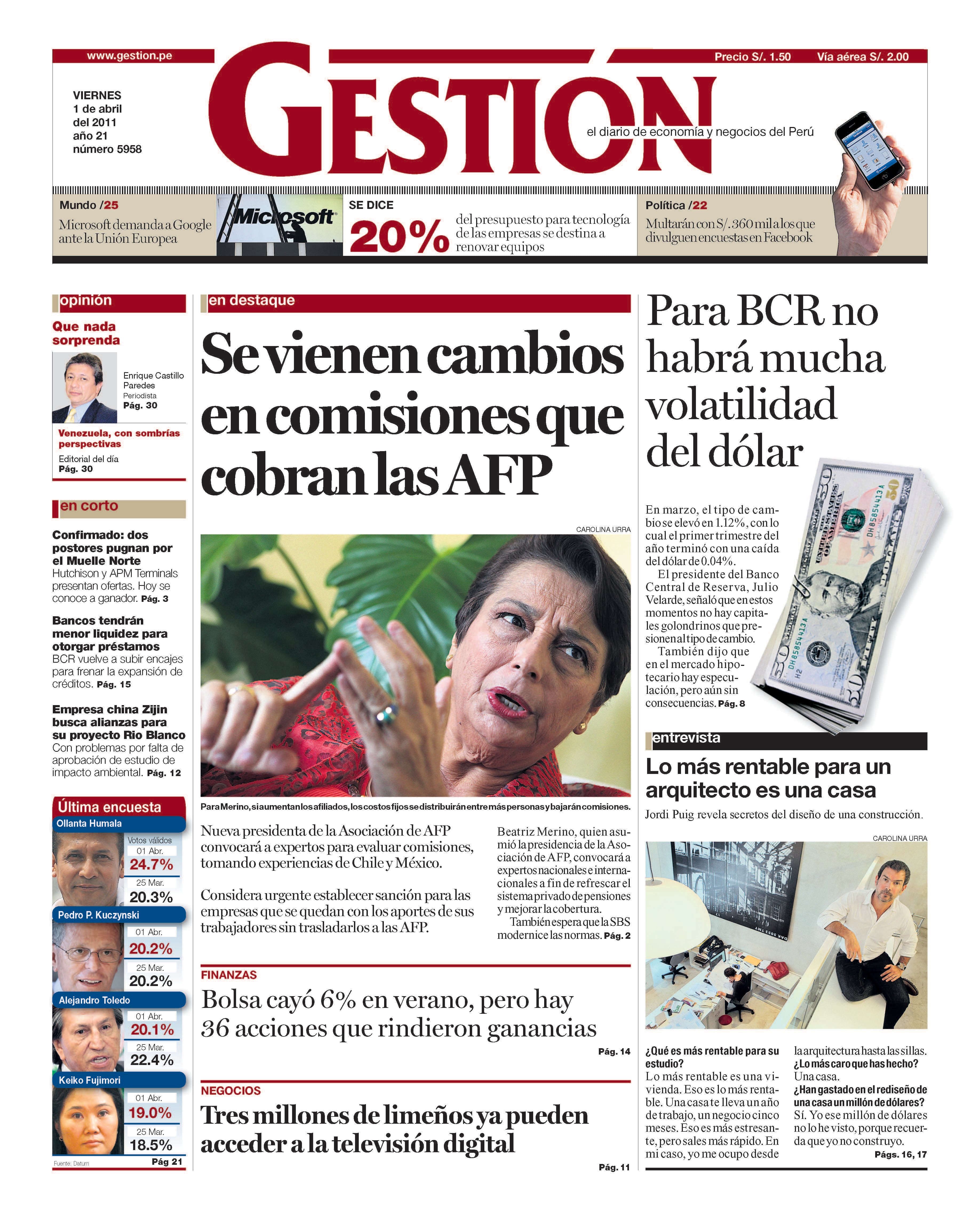 Nueva presidenta de la Asociación de AFP convocará a expertos para evaluar comisiones, tomando experiencias de Chile y México. Considera urgente establecer sanción para las empresas que se quedan con los aportes de sus trabajadores sin trasladarlos a las AFP. Beatriz Merino, quien asumió la presidencia de la Asociación de AFP, convocará a expertos nacionales e internacionales a fin de refrescar el sistema privado de pensiones y mejorar la cobertura. También espera que la SBS modernice las normas.